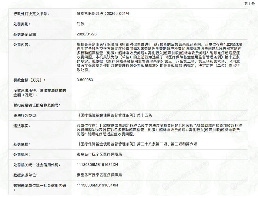 文号“冀秦抚医保罚决﹝2026﹞001号”行政处罚决定书露出,秦皇岛市抚宁区妇幼保健院存在以下作歹事实:1.β2微球卵白测定多样免疫学神情过度查验问题;2.床旁彩色多普勒超声查验加收超圭臬收费问题;3.浅表器官彩色多普勒超声查验(乳腺)超圭臬收费问题;4.雾化吸入(超声加收)超圭臬收费问题;5.射频电疗超适当症收费问题。